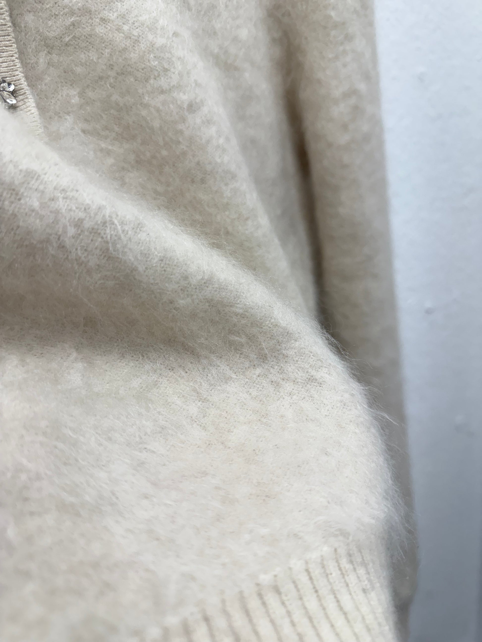 Das Modell kommt in einem warmen, cremefarbenen Ton und hat einen klassischen Polokragen. Besonders edel wirken die glänzenden Schmuckknöpfe an der Knopfleiste, die dem Pullover eine feminine, luxuriöse Note verleihen.