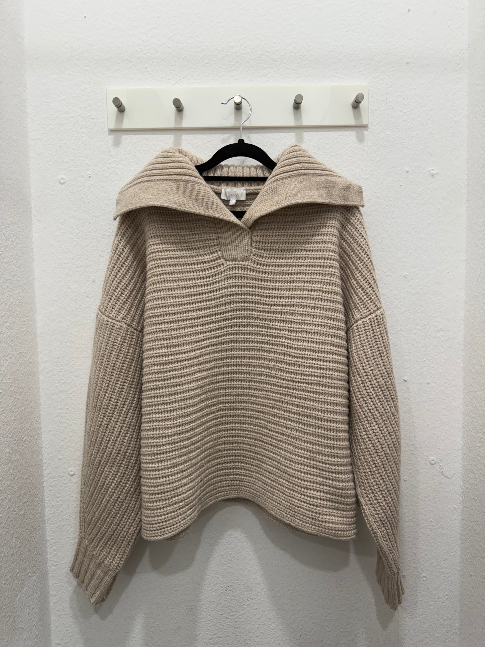 Das markante, strukturierte Strickmuster und der elegante Kragen verleihen dem Modell einen modernen, leicht maritimen Look.