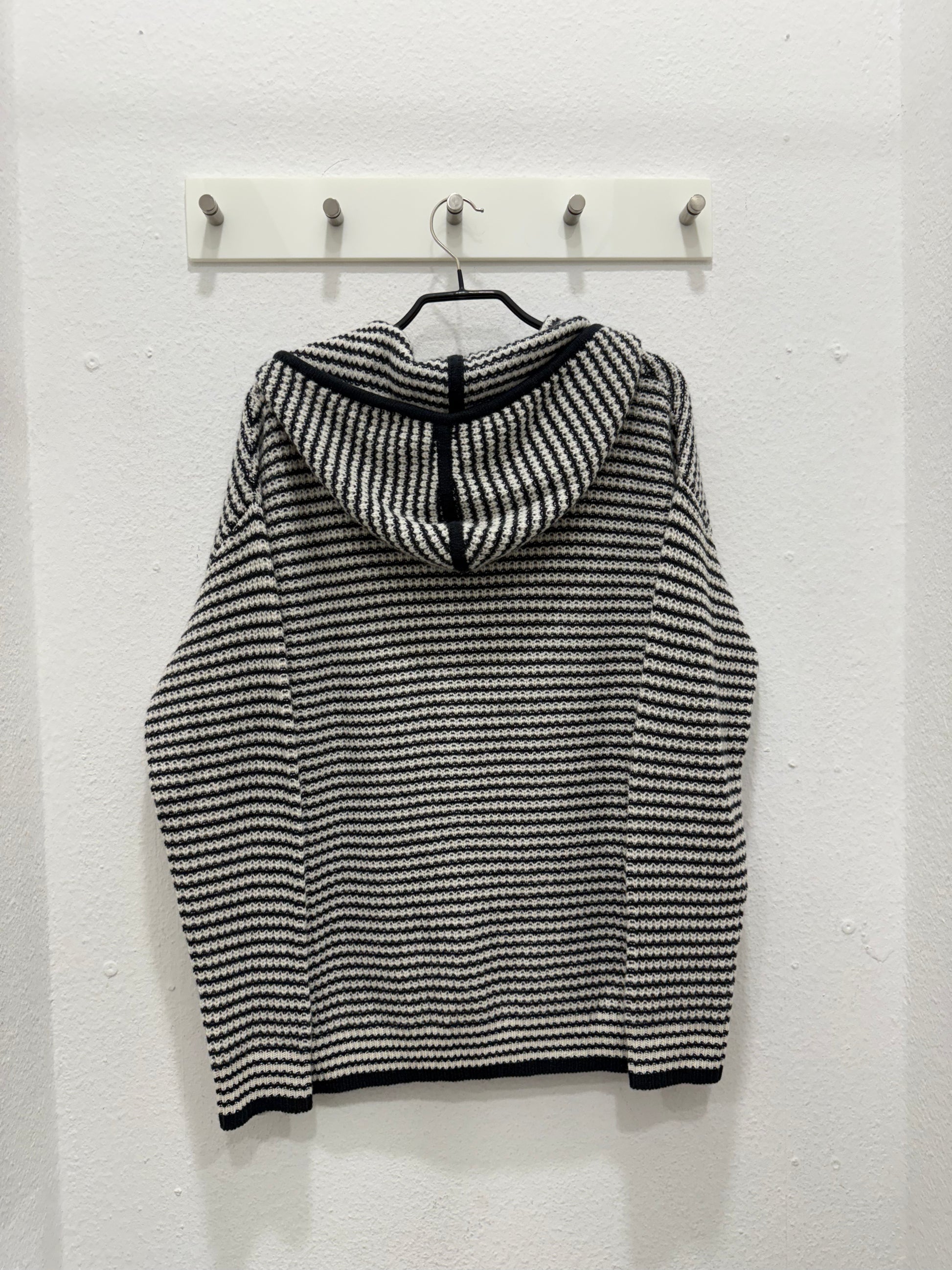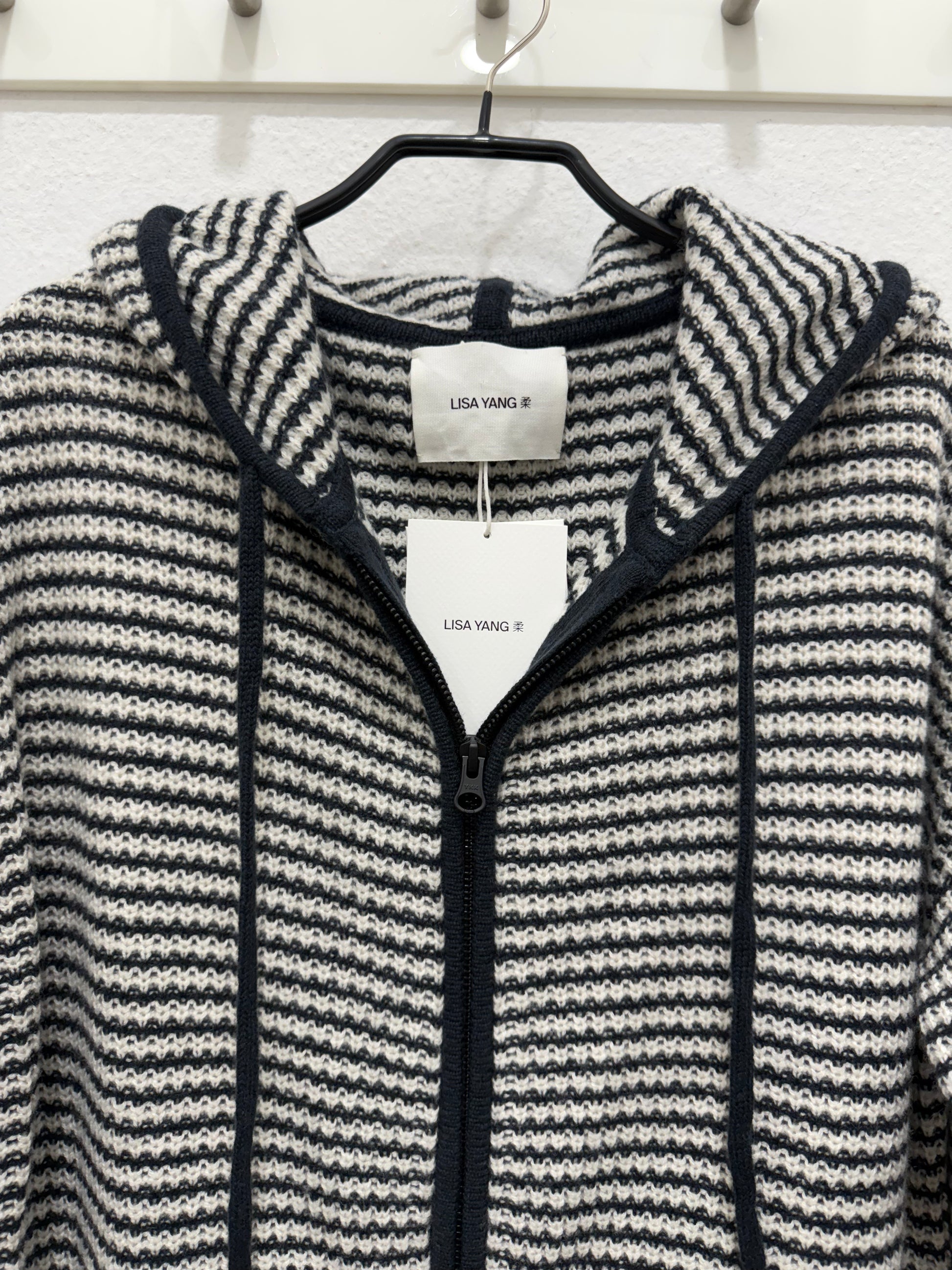 Weiche, luxuriöse Strickjacke aus reinem Kaschmir mit maritimem Streifenmuster in Creme und Dunkelblau.